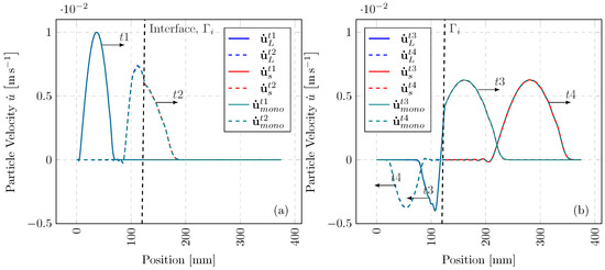 Axial wave propagation in a heterogeneous bar: (a)—boundary condition at ms and initial transmission at ms of the stress wave; (b)—transmission and reflection of the stress wave at ms and ms.