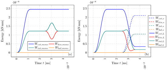 In Figure 4, we show each of the components of energy and its overall balance. For both monolithic and multi-time-step solutions, a smooth transition of energy is observed as the wave interacts with . Remarkably, as the temporal coupling is enforced, the for both and is of the order kNmm, significantly below each of the components at kNmm. This numerical example captures the propagation of a smooth pulse; however, severe loading cases, highly heterogeneous domains, and 3-D problems, with further details are provided in the following work [35].