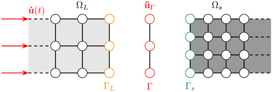 with dimensions determined by and , as the number of nodes on the interface of the subdomain and the number of nodes on the interface , respectively. Therefore, interpolates using Lagrangian shape functions for the two subdomains and :
