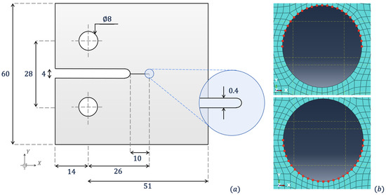(a)—Diagram of compact-tension specimen with dimensions in [mm], as seen in Sommer et al. [39]; (b)—nodal sets on the meshed subdomain for prescribed velocity boundary conditions on top (+ve loading) and bottom (−ve loading) pins.