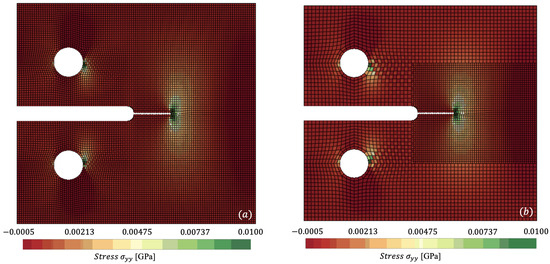 The following numerical study looks to represent the stress gradients prior to fracture in a compact-tension (CT) specimen test, utilising a similar geometry to the literature [38,39]. Figure 6a portrays the geometry modelled in the following example. As the specimen is loaded, stress concentrates about the specimen’s crack tip. We apply a ramped velocity boundary condition on nodes that create a semicircle for upper and lower pins, as shown in Figure 6b, with a maximum magnitude of 0.2 ms−1. Whilst uniformly distributed velocities are applied to each of the nodes in the pins, to replicate the contact pressure on the pins, methods such as those applied by Triclot et al. should be considered [40]. Material properties are similar to alumina with GPa, kgmm−3 and Poisson’s ratio . We model the CT specimen with three simulations: one using a fine mesh throughout the entire domain, one coupling a coarse and fine mesh with a single , and another with and integrating with multiple time steps and , respectively. Structured meshes are used in all cases where an element size of mm for fine and 1 mm for coarse. All simulations use , running for a maximum of ms.