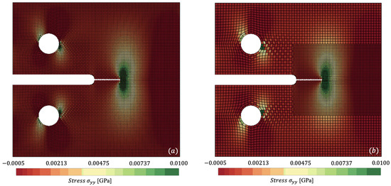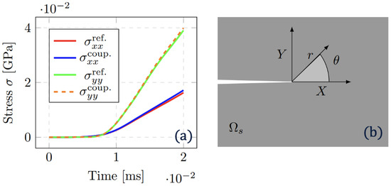 where r represents the radial distance from the crack, and the angle relative to the crack plane. Whilst J-integral and virtual crack closure techniques (VCCTs) have been developed for more accurately evaluating K, here the consistency in the method for both reference and coupled solution proves a sufficient comparison [43,44]. The stress and in the nearest element to the crack correspond to Figure 9a where strong alignment between spatially coupled and reference solution can be observed. In Figure 9b, the analysis computes and with mm, , mm and with the slight variation in the spatial discretisation of and summarising in Table 1. and compute a difference of 3.5% and 6.3% in value when comparing uncoupled and coupled solutions. This is deemed reasonable granted the approximation of the stress extrapolation method. For future comparisons, the contribution of multiple Gauss integration points could be considered with the aforementioned J-integral or VCCT methods.