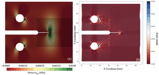 Comparison of for: (a)—combined spatial and temporal coupling (multi-time stepping); (b)—RMSE Error of for dynamically loaded compact-tension specimen at ms.
