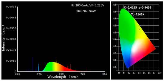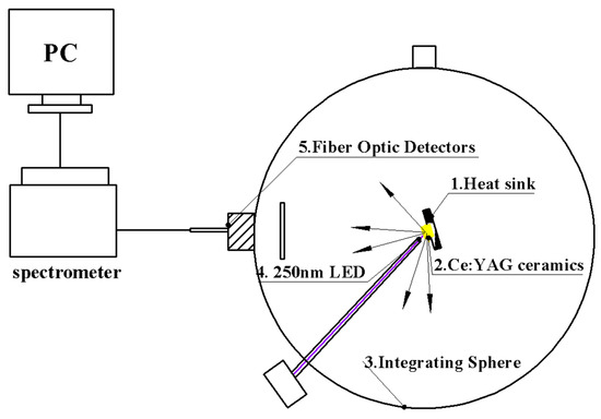 Figure 1 shows a schematic diagram of the energy conversion efficiency measurement set-up of the Ce3+:YAG in the ultraviolet band. During the measurement process, considering the relatively low radiant flux of the ultraviolet LED, the integration time for energy collection was adjusted to 60,000 ms, and the driving current was set to 200 mA.