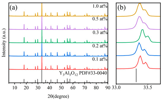 (a) XRD patterns of xCe3+: YAG (x = 0.1–1.0 at%), (b) an enlarged view in the range of 33.0–33.5° of xCe3+: YAG (x = 0.1–1.0 at%).