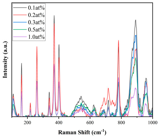 As shown in Figure 5, we tested the Raman spectrum of xCe3+: YAG (x = 0.1–1.0 at%). In the YAG lattice, the Raman peak at 100–200 cm−1 is related to the vibration of metal cations. The peaks at 200–300 cm−1 are due to the bending vibrations between O-Al-O and O-Y-O bonds, and the vibrations with frequencies between 300 cm−1 and 900 cm−1 can be attributed to the symmetrical stretching vibrations of the Al-O bonds [34]. It can be seen that as the doping concentration increases, the peak intensity gradually decreases.