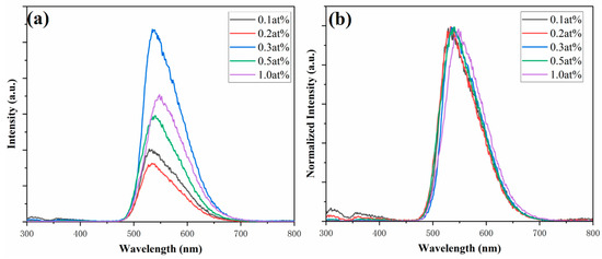 Next, the luminescence properties of the samples were studied. As shown in Figure 6a, the PL spectra (λex = 250 nm) of the xCe3+: YAG (x = 0.1–1.0 at%) were tested, and the emission peak of the samples was at 530 nm. The emission intensity increases with the increase of Ce3+ doping concentration and reaches the maximum at x = 0.3 at%. Beyond this doping concentration, the emission intensity decreases due to concentration quenching [35].