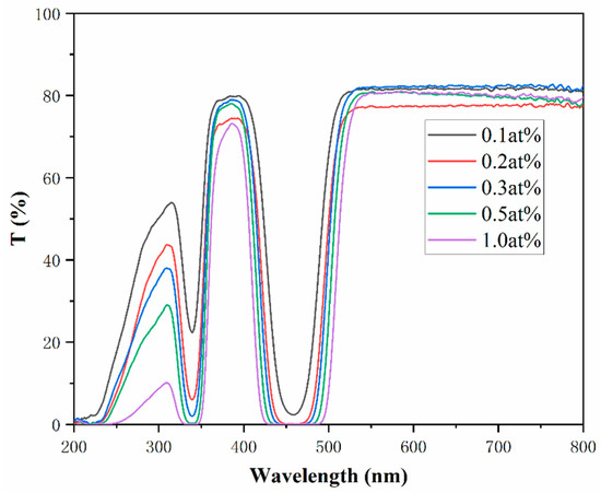 The transmittance curves of the samples were tested and are shown in Figure 7. The samples maintained high transmittance, reaching up to 80%. The lower transmittance in the 300 nm–350 nm and 400 nm–500 nm ranges can be attributed to the absorption of Ce3+. In addition, the Ce3+ absorption increases with the increases of doping concentration, resulting in a gradual decrease in the transmittance of the above two bands [40].