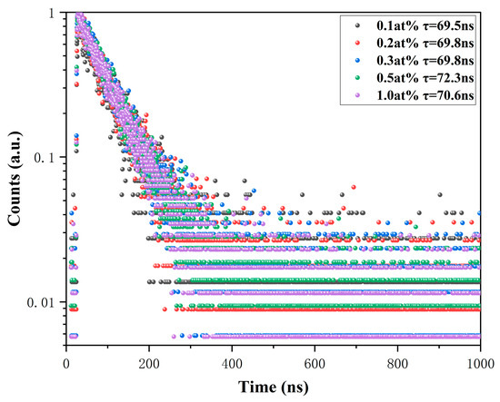 Next, the fluorescence decay curves of xCe3+:YAG (x = 0.1–1.0 at%) fluorescent ceramics at 530 nm were tested, which showed a single exponential model, as shown in Figure 8. We obtained the sample decay lifetime by fitting the single exponential decay equation, as shown in Equation (2):