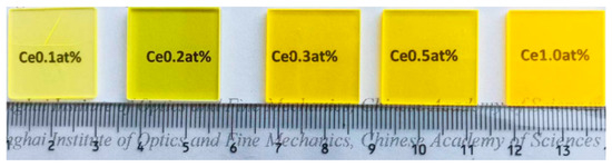 First, high-purity Al2O3 (99.999%, Aladdin, Shanghai, China), Y2O3 (99.999%, Aladdin, China), and CeO2 (99.99%, Aladdin, China) commercial powders were weighed according to the nominal (CexY1−x)3Al5O12 (x = 0.001, 0.002, 0.003, 0.005, and 0.01) formula. Next, the raw materials added with 0.5 wt% ethyl orthosilicate were mixed by ball milling (Planetary Ball Mill Nanjing Bo Yuntong Instrument XGB2, Shanghai, China) in ethanol for 24 h, followed by drying at 80 °C for 48 h. The resulting powder mixtures were first uniaxially pressed into plates at 10 MPa. Then, after cold isostatic pressing (cold isostatic pressing machine LDJ 100/320–300, Shanghai, China) at 210 MPa, the obtained green bodies were sintered in a high-temperature vacuum furnace (vacuum induction furnace/S furnace, Shanghai, China) at 1750 °C for 7 h. The specific experimental process is shown in Figure S1. Finally, the as-prepared transparent ceramic samples were cut into sheets measuring 20 mm × 20 mm × 1 mm.