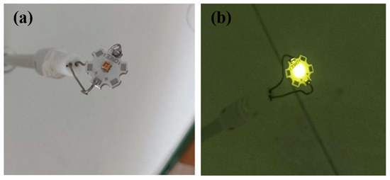 The raw materials for eutectic soldering packaging experiments were cut from 0.3 at% Ce:YAG samples. Two sets of experiments, A and B, were designed to study the impact of eutectic soldering on heat dissipation. Specifically, Group A was packaged using high thermal conductivity silver copper solder eutectic soldering, while Group B used traditional solid crystalline silicone as packaging material, as shown in Figure 12.