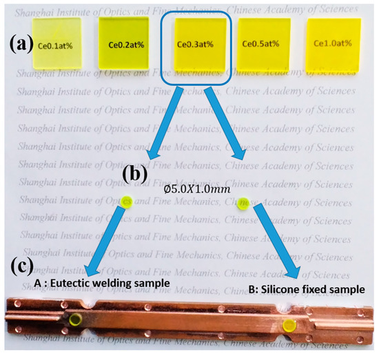 Photographs of the prepared scintillation ceramic series samples (a), packaged wafers processed from 0.3 at% samples (b), two sets of samples using eutectic welding (A) and silicone fixation (B), respectively (c).