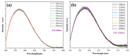 The photoluminescence (PL) spectra of scintillation ceramics under different driving currents: eutectic welding sample (a), silicone fixed sample (b).
