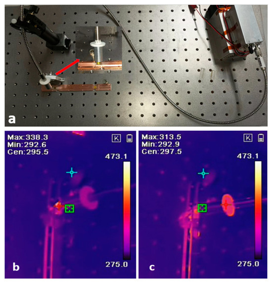 Actual picture of heat dissipation performance test device (a) and infrared thermal imaging images of two groups of scintillation ceramics under high-power laser excitation: silicone fixed sample (b), eutectic welded sample (c). Arrows are enlargement of local images.