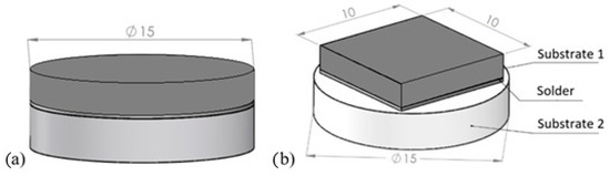 Figure 2a shows a schematic of the soldered joint for analyzing the solder–substrate boundaries, and the schematic for measuring shear strength is shown in Figure 2b.