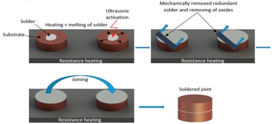The next step consisted of immersing the sonotrode of the soldering equipment into the molten solder for 5 s. Due to the effect of ultrasonic vibrations, the solder was activated, and the oxides in the soldering alloy were gradually disrupted and subsequently washed off of the solder surface. The prepared surfaces, along with the molten solder, were then brought together to form the bond. This joint assembly was then left to cool freely at room temperature. Figure 3 shows the schematic procedure of ultrasonic soldering.