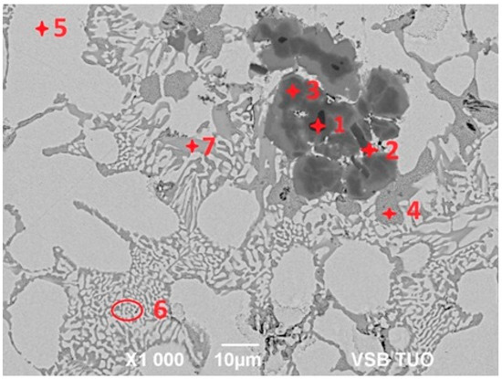 For determination of the chemical composition and identification of individual phases of Zn5Al1.5Mg1.5Ti solder (see Figure 7), SEM/EDX analysis of spectrum 1 through 7 were performed (see Table 3). Spot 1 represents a dark section, containing 70.8 at.% Al, 24.4 at.% Ti and 4.8 at.% Zn, corresponding to the intermetallic phase TiAl3. The dark-grey area at spot 2 contained 26.5 at.% Al, 67.7 at.% Ti and 5.8 at.% Zn, which is associated with the Ti3Al phase, exhibiting a considerably wide concentration range of interactions.
