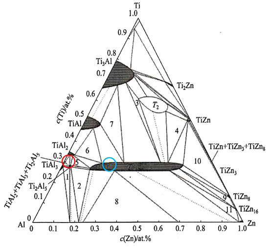 The brighter grey areas in spectrum 7 contained 59.7 at.% Al, 23.8 at.% Ti and 16.5 at.% Zn. Again, this corresponds to the ternary T phase, identified as TiAl3 (see Figure 8, marked with a blue circle). The ternary phase (see Figure 8) contains approximately 25 at.% Ti, with the aluminum content varying from 15 at.% Al to 60 at.% Al. Therefore, the T phase is stable over a wide range of Al and Zn concentrations at a constant titanium content of approximately 25 at.%.