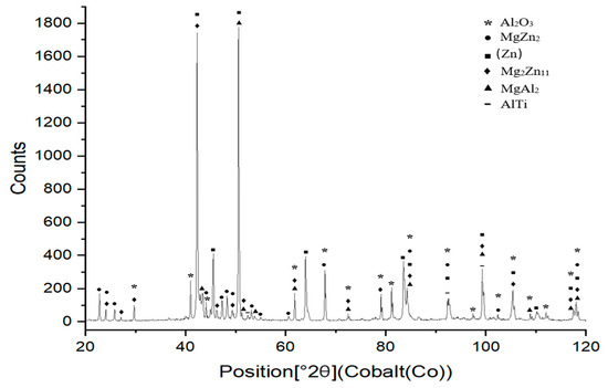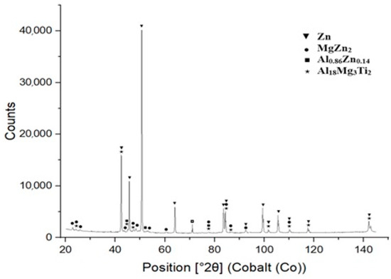 XRD measurements were performed using an energy dispersive X-ray spectrometer on specimens prepared from the bulk solder samples. The XRD analysis confirmed the presence of intermetallic phases, namely MgZn2, Al0.86Zn0.14 and Al18Mg3Ti2. The results from the diffraction analysis are documented in Figure 9.