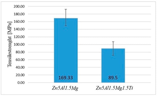 The obtained results for Zn5Al1.5Mg1.5Ti are summarized in Table 4. The minimum tensile strength was 71 MPa, while the maximum tensile strength reached 108 MPa. The average tensile strength calculated from the measured values was 89.5 MPa, and the median tensile strength was 89.5 MPa. The calculated range between the lowest and highest strength was 37 MPa. The standard deviation of the tensile strength measurements was 26.16 MPa, indicating some variation between the tested samples.