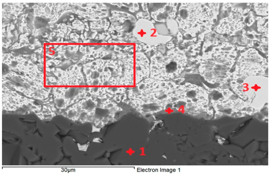 For the determination of chemical composition and identification of individual phases, SEM/EDX analysis was performed. The transition zone in the Al2O3/Zn5Al1.5Mg1.5Ti joint (Figure 11) was analyzed in more detail. The regions from 1 to 5, as given in Table 5, were analyzed. Location 1 stoichiometrically represents the Al2O3 substrate and corresponds well to the following proportion of elements: Al:O = 2:3, or 40:60.