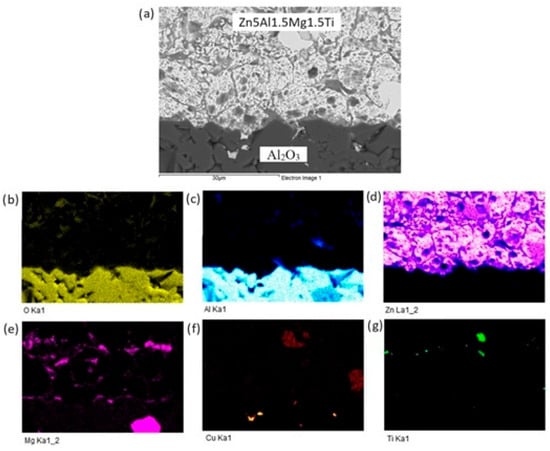 Planar distribution of elements in the boundaries of Al2O3/Zn5Al1.5Mg1.5Ti: (a) joint microstructure; (b) Ti; (c) O; (d) Al; (e) Zn; (f) Mg and (g) Cu.