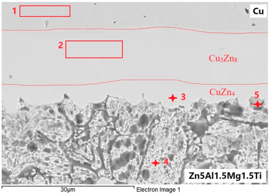 At the boundary of the Zn5Al1.5Mg1.5Ti/Cu joint, an undulated boundary was formed due to the application of ultrasonic power (Figure 14). The regions 1 to 5, presented in Table 6, were analyzed.