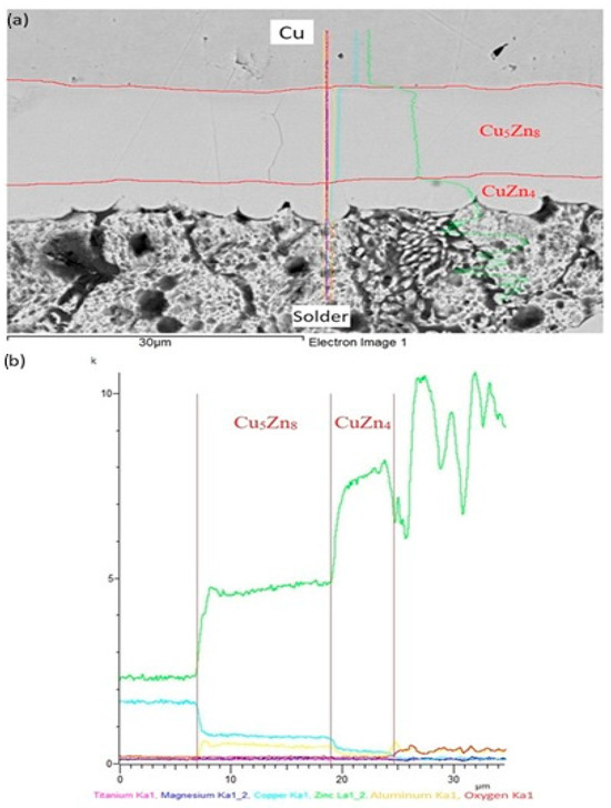 The line analyses shown in Figure 16 represent the concentration profiles across the boundary of the Zn5Al1.5Mg1.5Ti/Cu joint, over its entire length of 30 μm. The interaction of molten alloy with the Cu substrate has resulted in the partial dissolution of copper in the solder due to diffusion, leading to the formation of a new phase (Cu5Zn8) approximately 12 µm wide, and is circumscribed by the concentration profiles. Behind this, the identified CuZn4 phase appears, measuring approximately 5 µm wide.