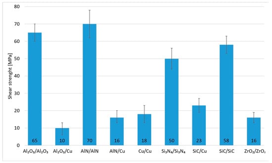 The research in this work focused on soldering Al2O3 ceramics and Cu substrates. The aim of this study was to assess the suitability of using an active solder of the type Zn5Al1.5Mg1.5Ti. Measurements were performed on three samples. In the case of the studied combination of Al2O3 ceramic and Cu substrate using Zn5Al1.5Mg1.5Ti solder, an average strength of 10 MPa (Figure 17) was attained. Given the versatility of Zn5Al1.5Mg1.5Ti solder and its potential applications in technical practice, the shear testing was also extended to other ceramic materials (Al2O3, AlN, Si3N4, SiC and ZrO2) in addition to Cu.