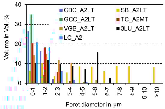 Filler size distribution (selection; see Supplementary Materials for overall results) based on one SEM picture with max. 5100 single particles.