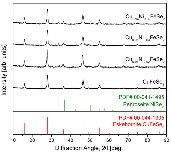 XRD patterns of eskebornite Cu1−xNixFeSe2 synthesized sintered using hot pressing. The diffraction pattern of CuFeSe2 is shown for comparison with the results from a previous study [20].