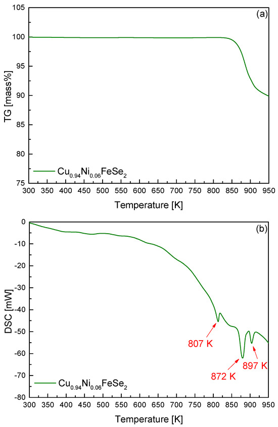 Figure 3 presents the thermal analysis results for Cu0.94Ni0.06FeSe2. To investigate phase transitions as the sample temperature increased, TG–DSC analysis was performed. As shown in Figure 3a, a sharp mass loss was observed at temperatures above approximately 870 K, which is attributed to the volatilization of elemental components, particularly selenium. In Figure 3b, the DSC curve exhibits small endothermic peaks at 807 K and 897 K, along with a significant endothermic peak at 872 K. Previous studies on pure eskebornite reported two endothermic peaks at 805–813 K and 891–895 K, attributed to phase transitions, including volatilization and melting [20]. In this study, a new and distinct endothermic peak was observed at 872 K. The melting point of eskebornite (CuFeSe2) is 850 K [27], and the melting point of penroseite (NiSe2), which was identified as a secondary phase in the XRD analysis shown in Figure 2, is 1123 K [28]. Therefore, the endothermic reaction at 872 K is interpreted as the melting reaction of Ni-doped eskebornite. Zhang et al. [17] reported that CuFeSe2 HP pellets are thermally stable up to 723 K. Moorthy et al. [18] found that both bulk and nano-CuFeSe2 exhibited endothermic reactions and significant weight loss due to the excessive volatilization of selenium at 675 K.