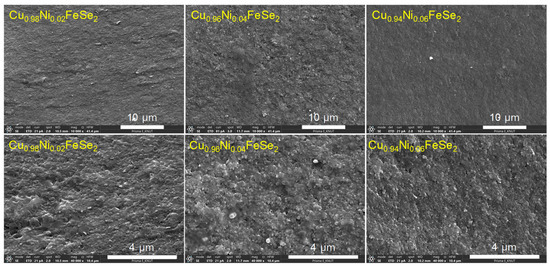 The fractured surface images of Cu1−xNixFeSe2 compacts are shown in Figure 4. No significant changes in microstructure were observed with varying Ni content. Additionally, the compacts were confirmed to be dense and free of pores. However, the secondary phase (penroseite: NiSe2) identified in the XRD analysis was not observed at grain boundaries or within the grains of the samples. The Lorentzian crystallite size of the Cu1−xNixFeSe2 compacts, analyzed using Rietveld refinement, decreased slightly from 85 nm to 76 nm as the Ni content increased from x = 0.02 to 0.06. These values are slightly larger than the crystallite size of pure CuFeSe2 (71 nm) [20], but the differences are not considered significant. In general, alloying elements added to a matrix often induce grain refinement by inhibiting grain growth due to the stress field generated around the solute atoms. However, in this study, the powders were already fine due to the MA process, and the compacts were formed (sintered) in the solid state rather than through a melting–crystallization process. Therefore, grain refinement effects caused by the solute elements are not expected.