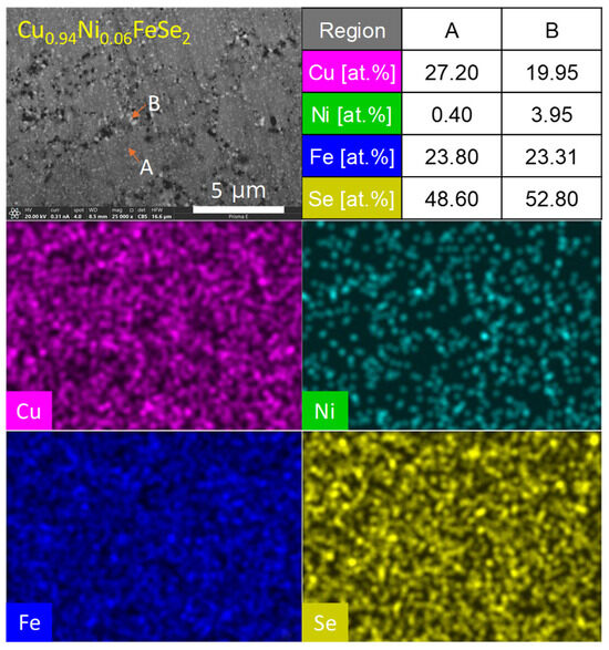 Figure 5 illustrates the microstructure of the polished surface of Cu0.94Ni0.06FeSe2, observed in backscattered electron mode, along with the results of EDS elemental analysis. The microstructure is divided into two distinct regions: flat gray regions (A) and small round white regions (B). The EDS elemental analysis was conducted with the following energy levels for the relevant elements: Cu (Kα = 8.040 keV, Lα = 0.930 keV), Ni (Kα = 7.471 keV, Lα = 0.851 keV), Fe (Kα = 6.398 keV, Lα = 0.705 keV), and Se (Kα = 11.207 keV, Lα = 1.379 keV). Despite the overlapping energy levels of Cu and Ni, which can complicate precise elemental analysis, region A is identified as Ni-doped eskebornite. On the other hand, region B, characterized by small white spots, is interpreted as corresponding to the secondary phase, penroseite (NiSe2), which was also detected in the XRD analysis. The presence of the penroseite phase is further supported by the EDS data from region B, where the elemental composition corresponds primarily to Ni and Se, matching the spectra of both penroseite and eskebornite. This suggests that the formation of the NiSe2 phase is localized within these regions, indicating partial phase separation due to the limited solubility of Ni in the eskebornite matrix at higher concentrations.