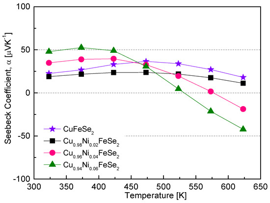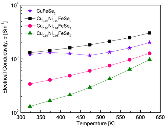 Figure 6 shows the temperature dependence of electrical conductivity for Cu1−xNixFeSe2. The electrical conductivity of semiconductors is expressed as σ = neμ (n: carrier concentration, e: electronic charge, and μ: mobility) [29] and is influenced by both carrier concentration and mobility. The observed increase in electrical conductivity with rising temperature aligns with the behavior of semiconductors. However, the electrical conductivity decreased with increasing Ni doping levels in the temperature range of 323–623 K, and its positive temperature dependence became more pronounced, indicating non-degenerate semiconductor behavior. Since intrinsic CuFeSe2 is a p-type semiconductor, substituting Cu+ with Ni2+ increases the electron concentration while reducing the carrier (hole) concentration, which explains this observation. For comparison, the electrical conductivity data for undoped CuFeSe2, as reported by Choi and Kim [20], are also presented. Moorthy et al. [18] observed a similar temperature dependence in electrical conductivity, despite differences in values compared to the CuFeSe2 data reported by Choi and Kim [20]. They reported a decrease in electrical conductivity from 6.7 × 103 Sm−1 at 300 K to 6.0 × 103 Sm−1 at 500 K, followed by an increase above 500 K. Zhai et al. [16] reported that the electrical resistivity of CuFeSe2 was so high that it could not be measured below 425 K. However, when the temperature increased to 723 K, the electrical conductivity rose to 2.7 × 103 Sm−1. In this study, the electrical conductivity of Ni-doped eskebornite exhibited lower values compared to that of undoped eskebornite reported in the literature. No prior studies were found on doping metallic cations into the Cu site of eskebornite, making direct comparisons with our results unavailable.