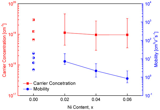 Figure 7 illustrates the charge transport properties of Cu1−xNixFeSe2, along with a comparison to the literature values for undoped CuFeSe2. Since eskebornite is a p-type semiconductor, substituting Cu+ with Ni2+ is expected to generate additional electrons, thereby decreasing the carrier (hole) concentration. The carrier concentration of undoped CuFeSe2 has been reported to range from 6.6 × 1018 cm−3 to 1.2 × 1019 cm−3, and the mobility ranges from 2.5 cm2V−1s−1 to 20.0 cm2V−1s−1 [20,27]. In this study, Ni doping resulted in a slight decrease in the carrier concentration, from 1.1 × 1019 cm−3 to 9.6 × 1018 cm−3, which is consistent with the expected reduction in hole concentration due to the introduction of additional electrons from Ni2+ substitution. Furthermore, the mobility of the Ni-doped samples significantly decreased from 7.2 cm2V−1s−1 to 0.8 cm2V−1s−1. This reduction in mobility can be attributed to several factors. First, the introduction of Ni atoms can increase carrier scattering due to the difference in ionic sizes and charge states between Cu+ and Ni2+, which disrupts the regular lattice and affects the ease with which carriers move through the material. Additionally, the presence of the secondary phase NiSe2, as observed in previous XRD and microstructural analyses, may contribute to further carrier scattering at the interfaces between the eskebornite and penroseite phases. Grain refinement can also contribute to a decrease in mobility, as smaller grain sizes lead to increased grain boundary scattering, further impeding carrier movement.
