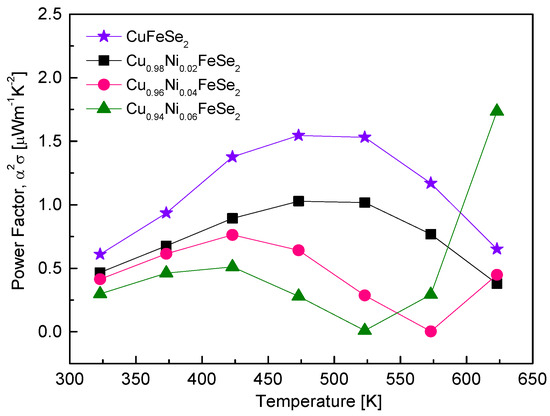 Temperature dependence of the power factor for Cu1−xNixFeSe2. The data for undoped CuFeSe2 (x = 0) are cited from reference [20].