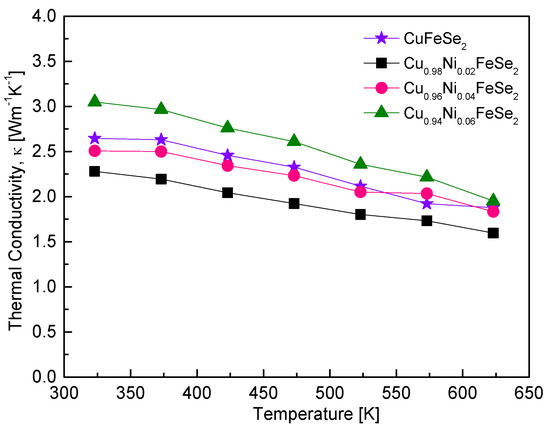 Figure 9 shows the power factor (PF) of Cu1−xNixFeSe2. Within the measured temperature range, the PF reached peak values before decreasing. This behavior results from differences in the temperature dependence of electrical conductivity and the Seebeck coefficient. For CuFeSe2, a maximum PF value of 1.55 μWm−1K−2 was reported at 473 K [20]. In this study, Ni doping reduced both the peak PF value and the temperature at which it occurs. This is attributed to the increase in the Seebeck coefficient with Ni doping being outweighed by the decrease in electrical conductivity. However, with increasing Ni content, the PF sharply increased at high temperatures (573 K for Cu0.96Ni0.04FeSe2 and 523 K for Cu0.94Ni0.06FeSe2). Cu0.94Ni0.06FeSe2 recorded a maximum PF of 1.75 μWm−1K−2 at 623 K. The rise in PF at high temperatures for Ni-doped samples can be attributed to the p–n transition induced by Ni doping, as shown in the temperature dependence of the Seebeck coefficient in Figure 8. This suggests the potential for Ni-doped eskebornite to be utilized as an n-type thermoelectric material at high temperatures. Moorthy et al. [18] reported that the PF of CuFeSe2 increased monotonically with temperature in the range of 300–645 K, reaching a maximum value of 2.07 μWm−1K−2, but this was for p-type eskebornite. Zhai et al. [16] observed that in Cu-excess eskebornite, the intrinsic transition did not occur up to 723 K, and the PF increased with temperature. They argued that excess Cu creates Se vacancies, significantly enhancing the PF of n-type eskebornite; for instance, Cu1.03FeSe2 achieved a PF of approximately 40 μWm−1K−2 at 623 K. However, they emphasized that the non-stoichiometric approach resulting from excess Cu doping leads to the formation of the Cu2Se (p-type) phase, necessitating the optimization of Se vacancies.