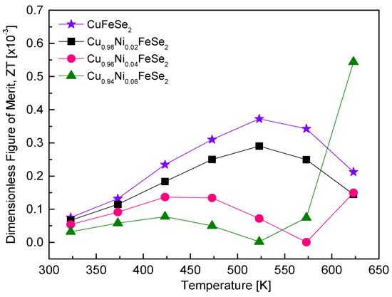 Figure 11 shows the thermoelectric performance of Cu1−xNixFeSe2 in terms of ZT values. Since ZT is proportional to the PF and inversely proportional to thermal conductivity, it reflects the combined temperature dependence of these two parameters. The temperature dependence of ZT and its variation with Ni content closely resemble the PF plots in Figure 9. Ni doping in eskebornite introduces significant shifts in thermoelectric performance, particularly distinguishing between low-temperature ZT values (ZTp) and high-temperature ZT values (ZTn). Undoped CuFeSe2 synthesized using the MA–HP process achieved a ZTp of 0.37 × 10−3 at 523 K [20], but Ni doping slightly reduced the ZTp, with Cu0.98Ni0.02FeSe2 exhibiting a maximum ZTp of 0.30 × 10−3 at 523 K. In contrast, high-temperature ZTn values showed marked improvement, as evidenced by Cu0.94Ni0.06FeSe2 achieving a ZTn of 0.55 × 10−3 at 623 K. Comparatively, Moorthy et al. [18] reported a significantly lower ZTp (9.8 × 10−4 at 645 K) for CuFeSe2 fabricated via melting, annealing, and hot pressing, which increased dramatically to 2.0 × 10−2 when synthesized as nanoparticles using a hydrothermal method, mainly due to a 580% reduction in thermal conductivity. Zhai et al. [16] demonstrated that Cu1.03FeSe2, synthesized using a multistep process, achieved a superior ZTn (1.2 × 10−2 at 623 K), attributed to an enhanced power factor and reduced thermal conductivity. These results highlight the interplay between doping, synthesis techniques, and compositional tuning in optimizing thermoelectric properties, with Ni doping effectively improving high-temperature performance while synthesis strategies like hydrothermal methods or Cu excess substantially reduce thermal conductivity, enhancing overall ZT values.