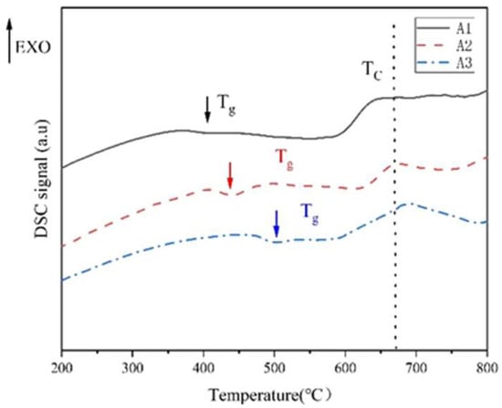 The phase-separation range in the original glass was determined by the DSC method. As shown in Figure 1, the temperature corresponding to the first endothermic peak is the glass transition temperature Tg. TL is a double-node (critical) temperature, and the phase-separated glass is mixed again at this temperature point. The phase-separation temperature range is between Tg–TL, and 600 °C is selected as the heat treatment temperature. Through the DSC diagram of A1, A2 and A3 samples, it can be seen that the glass transition temperature and double-node temperature of the samples change monotonously with the R value. When R ≤ 0.3, Tg increases from 400 °C to 500 °C. The formation of [BO4] and Si-O-B structure in sodium borosilicate glass is the main reason for the increase in glass transition temperature []. The increase in R value leads to the increase in free oxygen, the increase in [BO4], the more stable glass network structure and the increase in glass transition temperature.