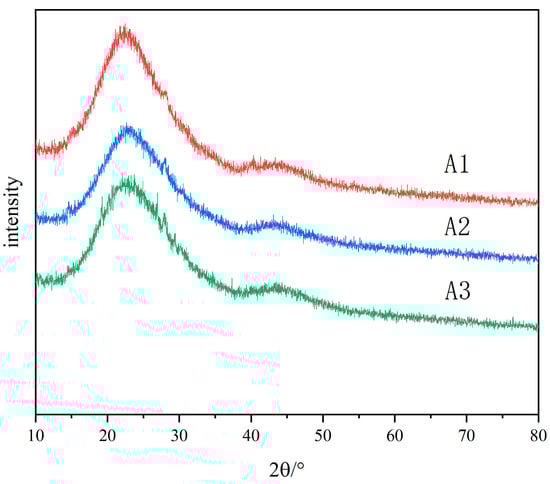 The original glass is colorless and transparent. After heat treatment, A1 and A2 samples show white opacities, and A3 samples show slight blue opacities and remain transparent. The samples after heat treatment were analyzed by X-ray diffraction. Figure 2 shows the X-ray diffraction patterns of A1, A2 and A3 samples after heat treatment at 600 °C for 5 h. It shows that the increase in R value strengthens the connectivity of the glass network, slows down the phase-separation trend of the glass, and increases the stability of the glass. The two main peaks observed in the XRD pattern are located at 2θ = 22° and 2θ = 45°, corresponding to B2O3 and SiO2, respectively, which are the common characteristics of glass containing mixed-network-forming bodies. There is no crystal precipitation in the samples of each component after heat treatment, and the opaque glass is caused by phase separation.