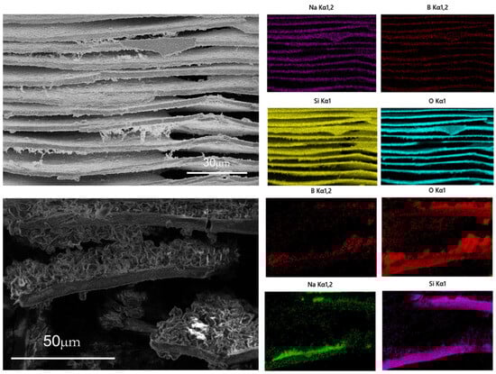 Samples with varying R values, after being heat-treated at 600 °C for 5 h, were acid-leached, and the SEM images of the resulting glass samples are depicted in Figure 3. From Figure 3a,b, it can be seen that the PGA1 and PGA2 formed a more obvious layered structure from the macroscopic structure after leaching. From Figure 3d,f, it can be seen that the layer is composed of a worm-like structure with a large number of pores. Figure 3c shows that after leaching treatment, PGA3 did not exhibit layering phenomena on a macroscopic level, and the overall structure remained intact. Figure 3f indicates that the surface of PGA3 also displayed a worm-like structure. The sample phase separates the silicon-rich phase and the sodium-rich boron phase. The sodium-rich boron phase and the silicon-rich phase form a bicontinuous phase. After leaching, the sodium-boron phase dissolves, leaving the silicon-rich phase. The worm-like structure is mainly composed of amorphous silica, which can also be proved by EDS (Figure 4). From samples (d), (e), and (f), it can be observed that as the R value increases, the leached silica skeleton becomes denser, and the average width of the silica decreases. The bicontinuous phase formed by the sodium boron phase and the silicon-rich phase is finer and denser, indicating that the R value increases and the phase-separation degree of the sample decreases.