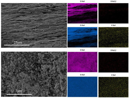 As shown in Figure 5, vanadium pentoxide is uniformly loaded in the porous glass. The layered structure of the porous glass remains intact, and the pore structure is not destroyed. The uniformly distributed V2O5 can effectively increase the exposed area of the catalytic active sites and promote the adsorption of reactants through surface oxygen vacancies and acidic sites. In addition, the uniform load also avoids the local aggregation of V2O5 at high temperature [,,].