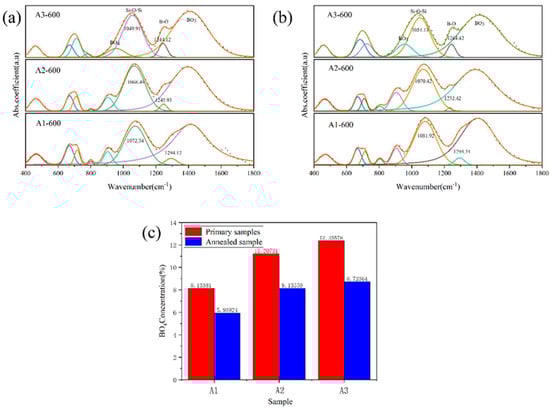 The fitting infrared spectra of A1, A2 and A3 samples before phase separation (a) and after phase separation (b), and the integral area ratio of [BO4] and [BO3] before and after phase separation (c).