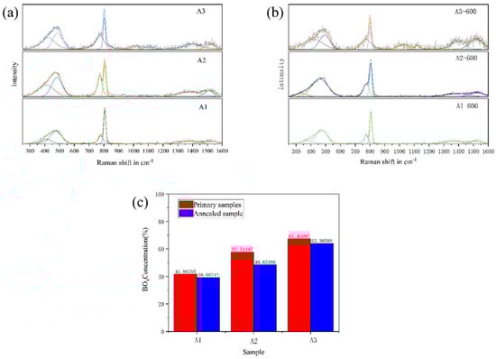 The fitted Raman spectra of A1, A2 and A3 samples before phase separation (a) and after phase separation (b), and the ratio of the integral area of [BO4] and [BO3] in the boron oxide ring before and after phase separation (c).