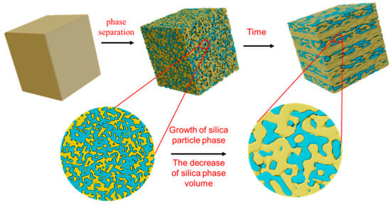 With the passage of time, the results of phase separation show that the silica layer gradually becomes thinner, while the silica phase particles gradually increase (see Figure 8 and Figure 9). The growth of these particles is a result of the subsequent stage of phase separation, which effectively reduces the interfacial energy of the system and thereby enhances the overall thermodynamic stability. In the process of phase separation, the sodium-rich boron phase is gradually separated from the glass matrix, and its volume increases gradually, while the volume of the silicon-rich phase decreases accordingly. The silicon-rich phase must shrink to ensure that the silica particles can continue to grow while the volume of the silicon-rich phase decreases. The rigidity of the silicon–oxygen bond limits the fluidity of the silicon-rich phase. The silicon-rich phase cannot move on the macroscopic scale, so that it is still a bicontinuous structure after long-term phase separation.