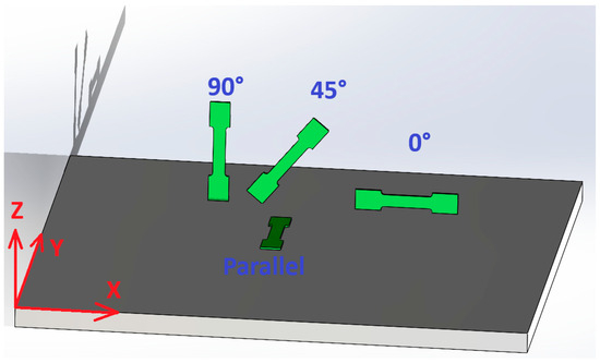 In the conducted tests, the 3D printing technology from the Powder Bed Fusion group was used to manufacture the samples. The samples were made in four variants of the location on the building platform: three in the XZ plane and one in the XY plane, as shown in Figure 1. The shape of the samples is shown in Figure 2, where the dimension of 2 mm (thickness) was changed, depending on the type of sample, to 1 mm, 1.4 mm, 1.8 mm, and 2 mm. The samples were marked by the code D-T-K, where D is the printing angle (0°, 45°, 90°, or FD (parallel to the building platform)), T is the thickness of the sample (1, 1.4, 1.8, and 2.0 mm—labeled as 1, 14, 18, and 2, respectively), and K is the sample number in the series from 1 to 5. For example, samples with a thickness of 2 mm and a printing angle of 90° were described by the code D90-T2-1. The parallel sample was marked by the letter F, e.g., FD0-T2-1. The samples were shaped according to EN 10002-1:2001 (Metallic materials—Tensile testing—Part 1: Method of test at ambient temperature).