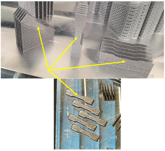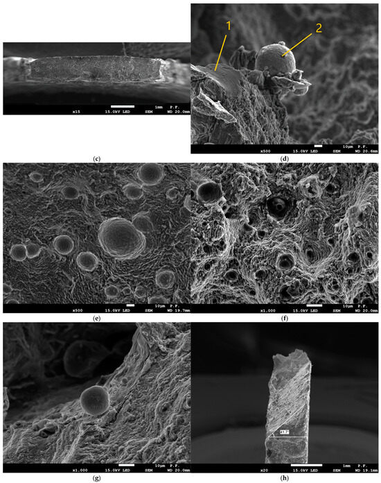 All the broken samples showed a fracture at an angle of thirty to forty-five degrees, as shown in Figure 18h,i. In the upper part of Figure 18a (marked in yellow), typical defects created during the manufacturing process can be seen, such as gassing or voids resulting from unmelted powder particles. Similar phenomena also occur in metal casting processes. Laser melting in the area of the small “lake” that is being formed can be classified as micro-metallurgy. Sample D0-T05 (Figure 18b) shows a material defect that constitutes 5–10% of the “a” dimension of the sample. Such defects cause stress concentration during stretching and can reduce the strength of the sample, especially that of thin-walled elements. Figure 18c shows a fracture with roundings on the edges created after exceeding the tensile strength limit. Laser-melted materials do not behave like typical ductile polycrystalline materials, and a classic neck is not formed during stretching. In Figure 18d, for sample FD0-T1, a residue of unmelted coagulated powder can be seen at location 1 and unmelted powder after gasification can be seen at location 2, which reduces the strength properties of thin-walled samples due to the lack of melting. Figure 18e,f shows the residue of unmelted powder filling the cavities and craters, which affect the reduction in mechanical properties. Figure 18g also shows a surface with visible unmelted powder particles supported from below by pouring smaller powder particles melted in the lower part, thus reducing the strength.