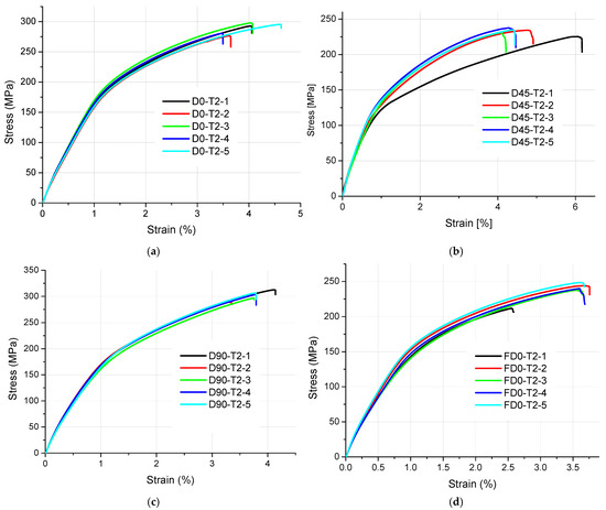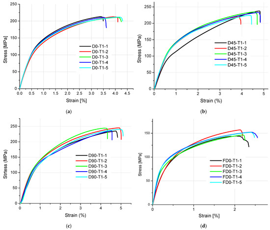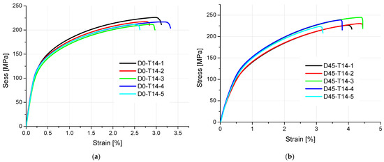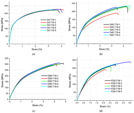 Tensile stress–strain curves of 2 mm thick samples made of AlSi10Mg aluminum alloy powder: (a) orientation: 0°, (b) orientation: 45°, (c) orientation: 90°, and (d) orientation: flat (0°).