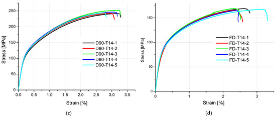 Tensile stress–strain diagrams of 1 mm thick samples made of AlSi10Mg aluminum alloy powder: (a) orientation: 0°, (b) orientation: 45°, (c) orientation: 90°, and (d) orientation: flat (0°).